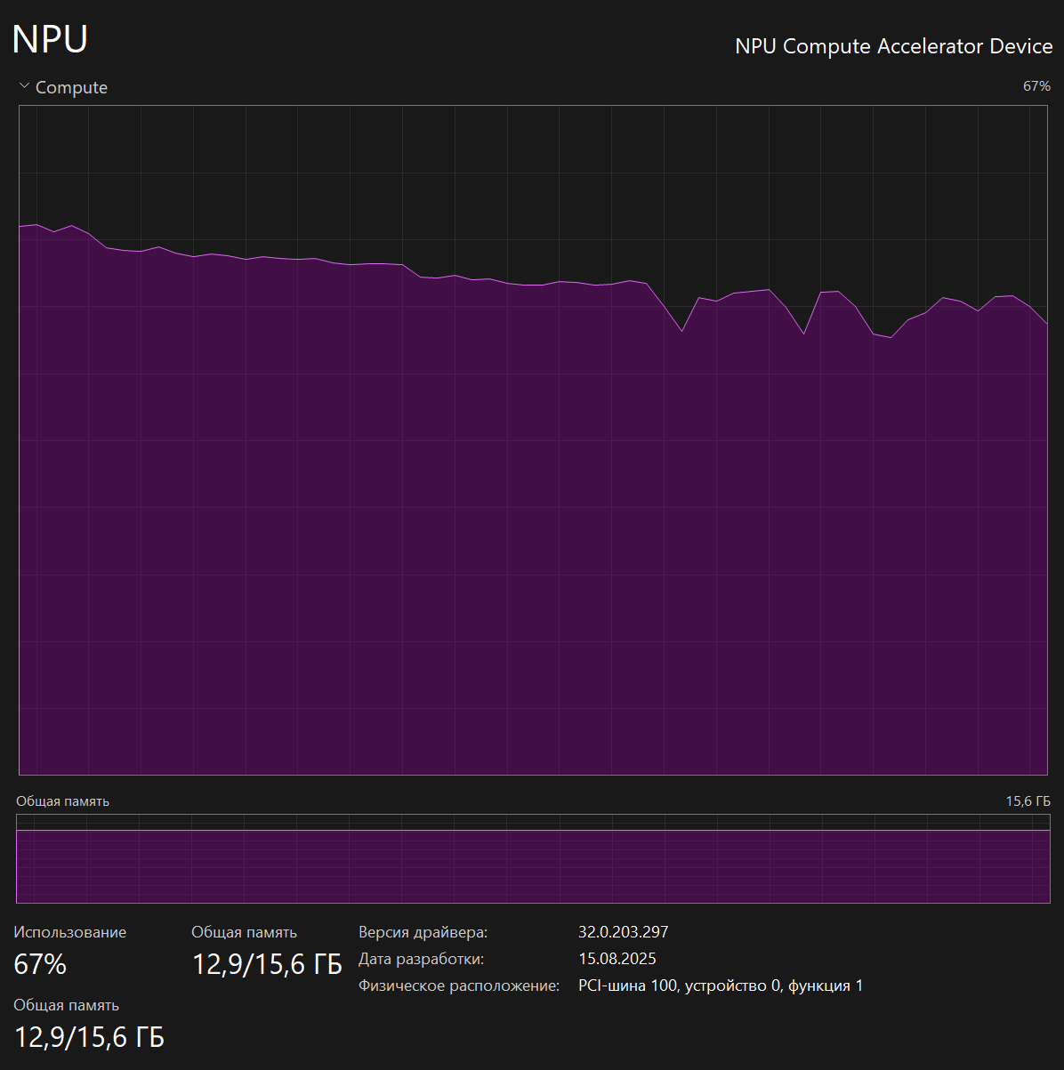 Эта модель уже потребляет почти 13гб памяти и что интересно, после начала генерации значение никак не меняется. Что еще более интересно, график показывает использование NPU в пределах 60-70%. Но генерация особо не падает, в среднем 10-11 tps.